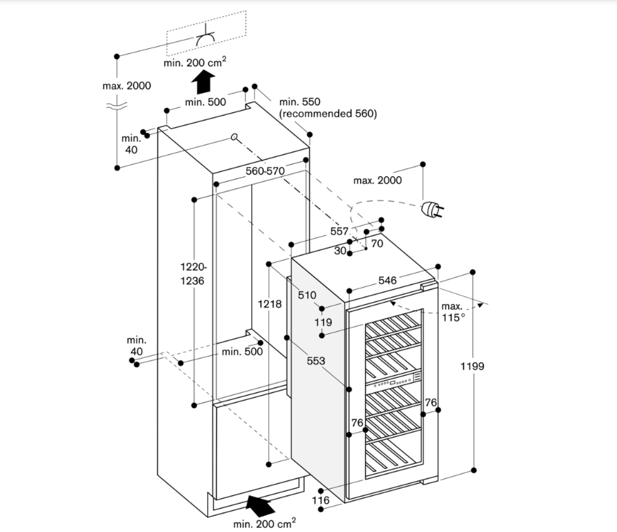 Винный климатический шкаф можно комбинировать со вторым винным климатическим шкафом или исключительно с морозильной камерой (RF 287 или RF 282). При комбинировании винного климатического шкафа с другими холодильными устройствами (RC, RT, RB) между устройствами необходимо соблюдать минимальное расстояние 150 мм во избежание образования конденсата.