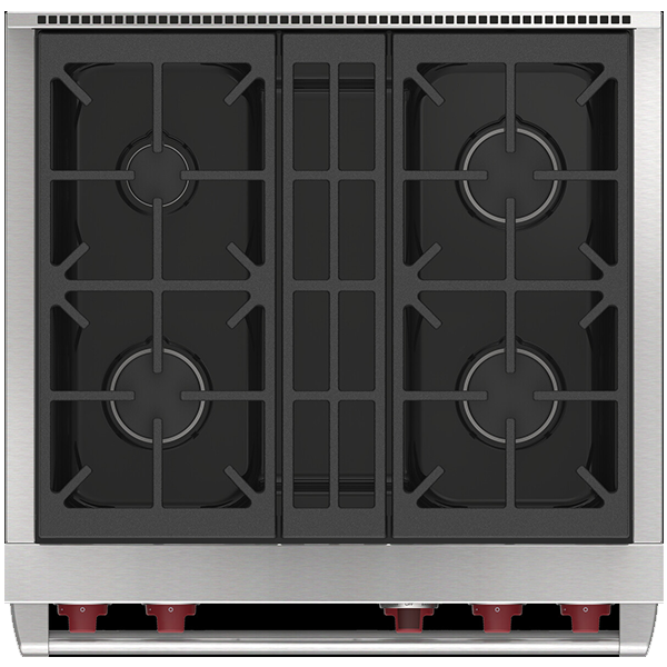 Газовая варочная поверхность состоит из четырёх горелок, мощностью от 2,7 кВ (для топления) до 5,3 кВ (для быстрого закипания и интенсивной обжарки) . Запатентованная двухуровневая конструкция газовой горелки Wolf позволяет максимально точно контролировать температуру нагрева. Система реподжига автоматически зажигает горелку при её заливе.