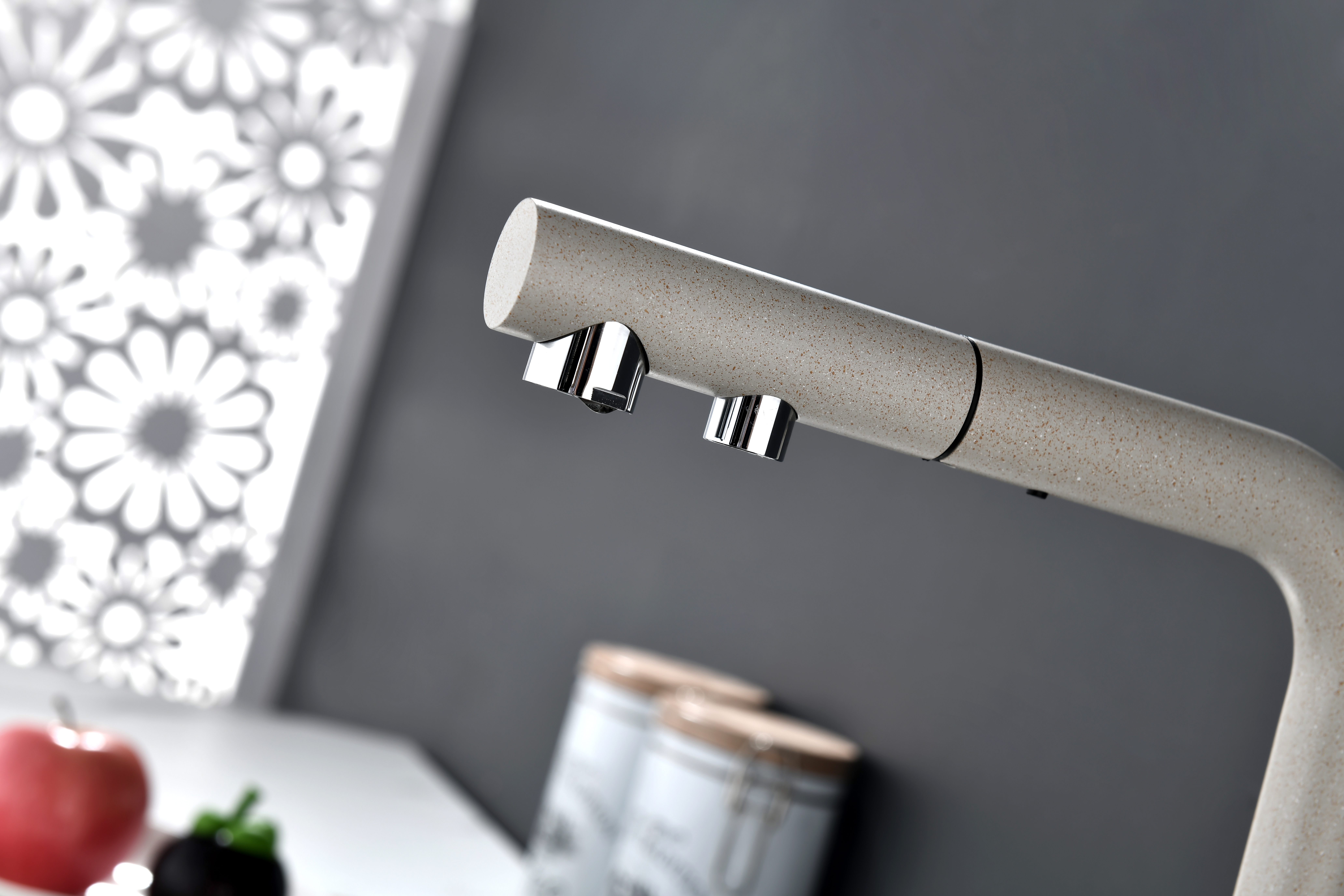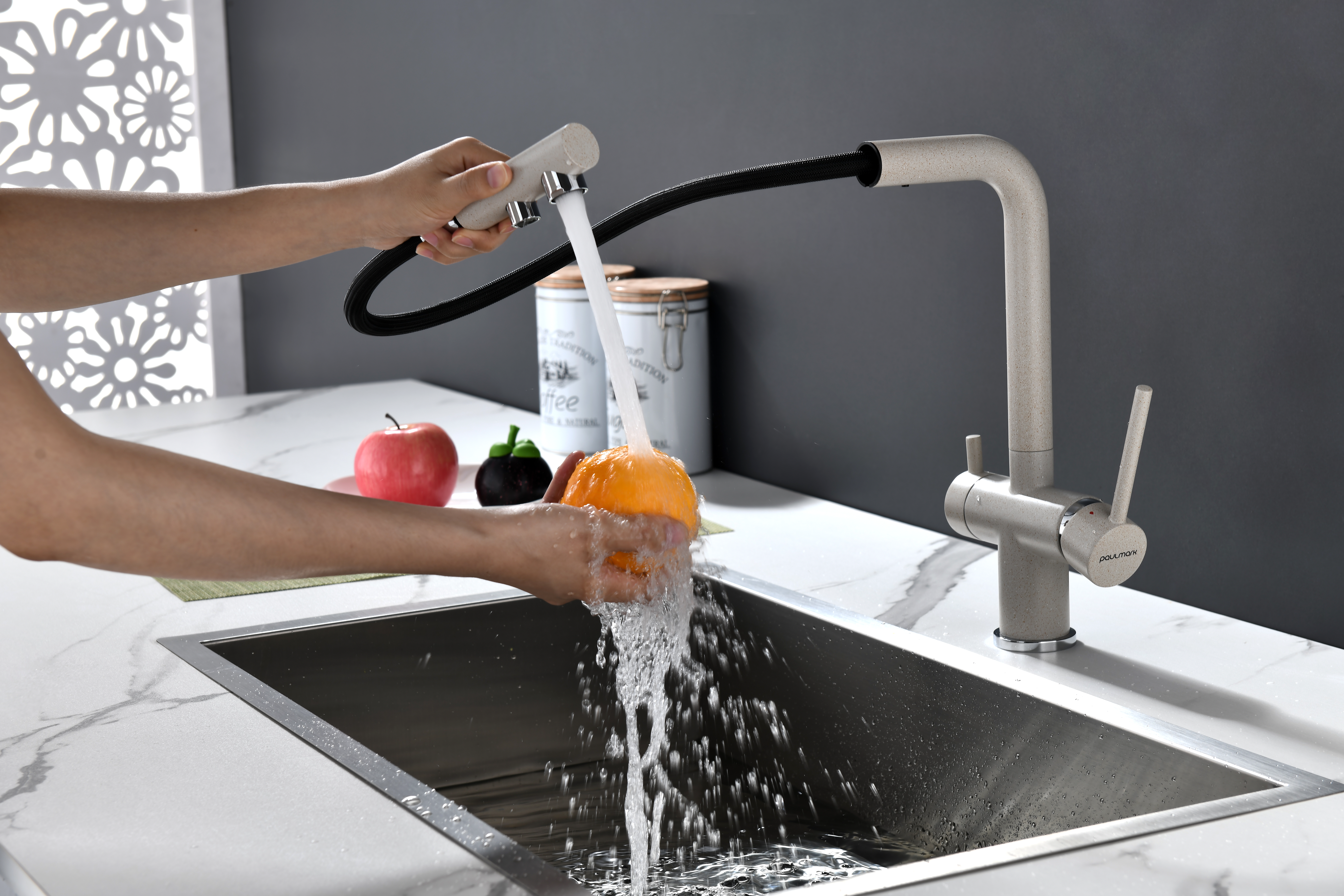 Смеситель оснащен гибким выдвижным изливом из нейлоновой оплетки, которая обладает отличной устойчивостью к истиранию и разрушению. Данная техническая особенность расширяет рабочую зону смесителя, позволяя пользоваться им с удобством в больших мойках, мойках с двумя чашами, или наполнять водой ёмкость на столе рядом с мойкой, в том числе питьевой водой.