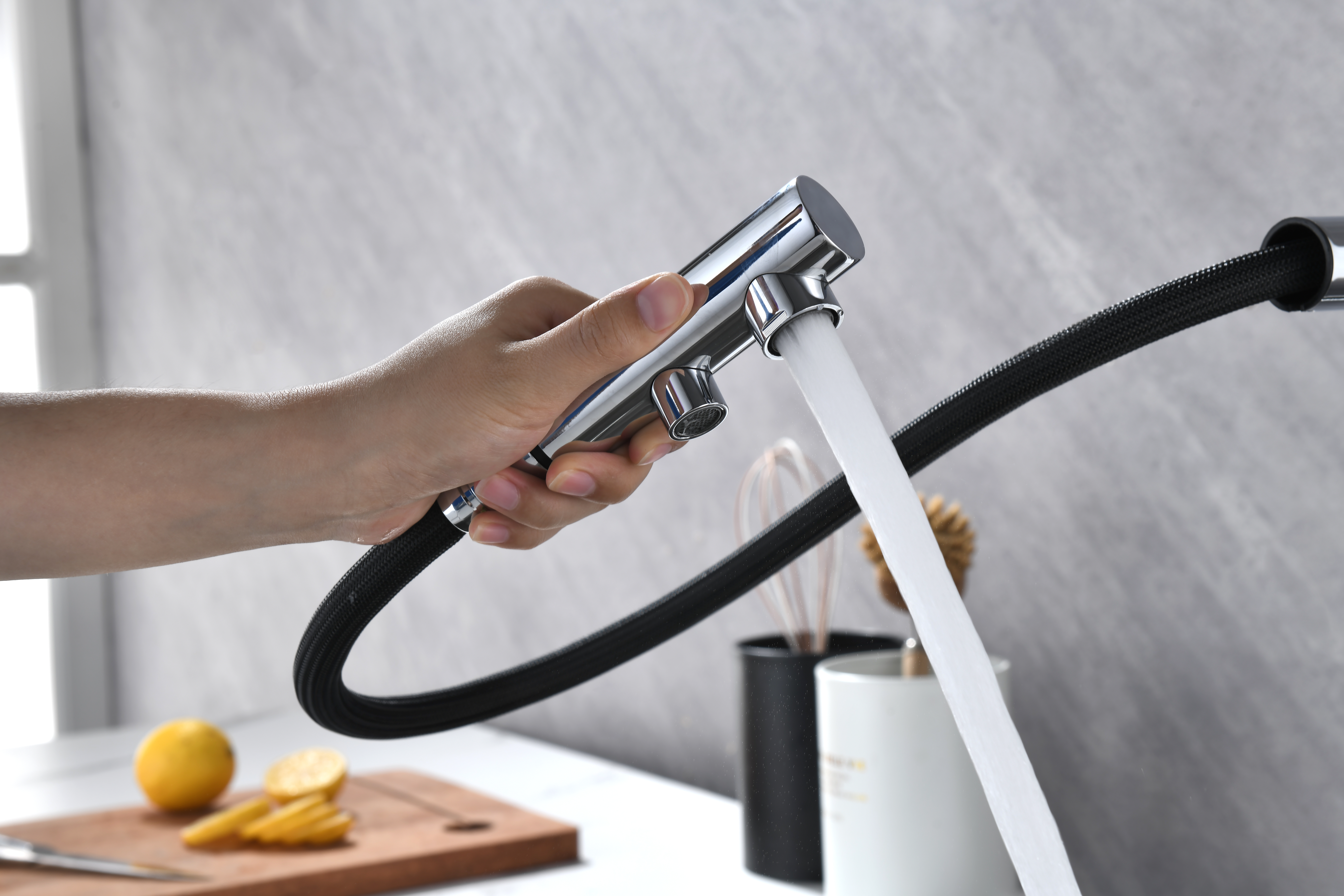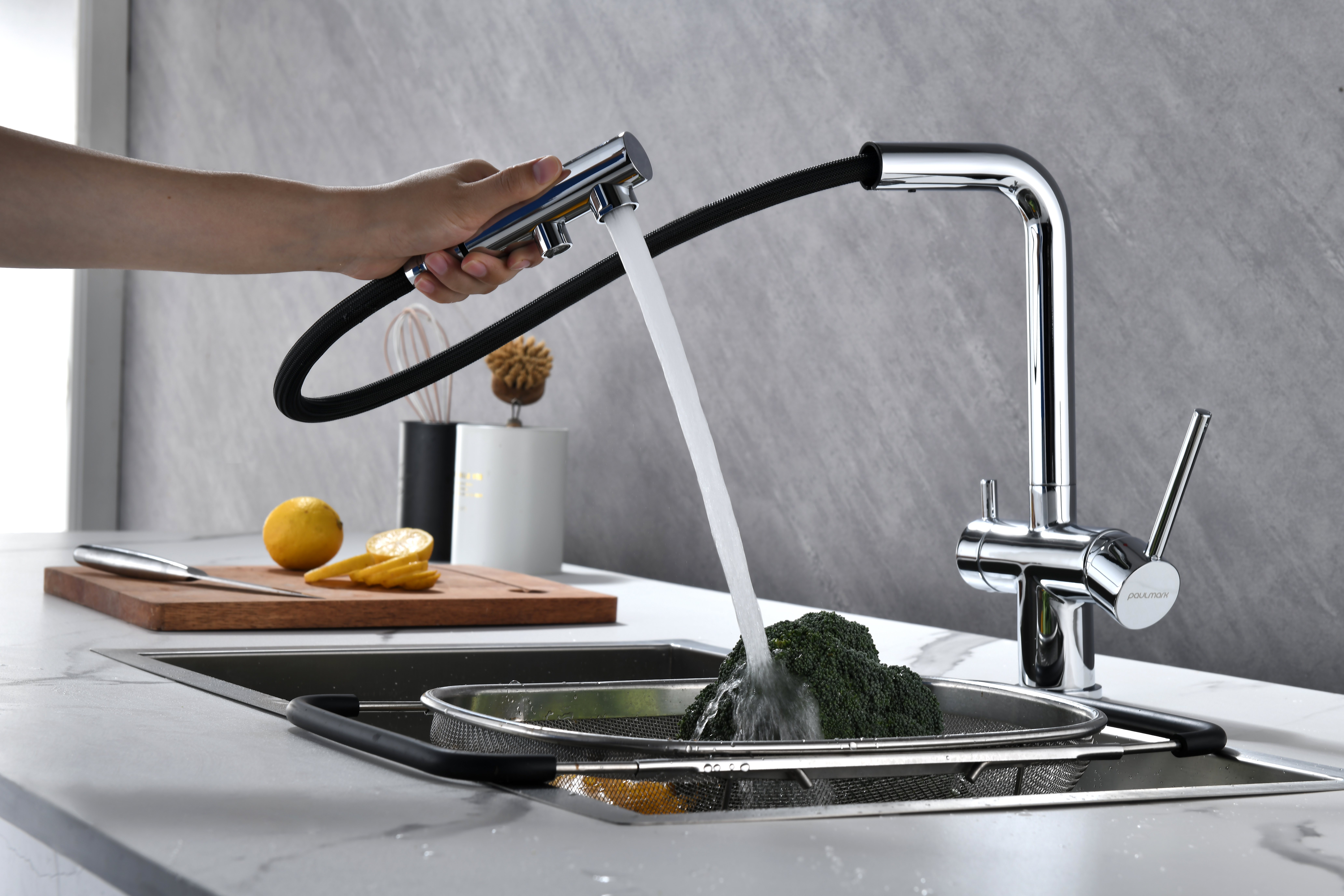 Смеситель оснащен гибким выдвижным изливом из нейлоновой оплетки, которая обладает отличной устойчивостью к истиранию и разрушению. Данная техническая особенность расширяет рабочую зону смесителя, позволяя пользоваться им с удобством в больших мойках, мойках с двумя чашами, или наполнять водой ёмкость на столе рядом с мойкой, в том числе питьевой водой.