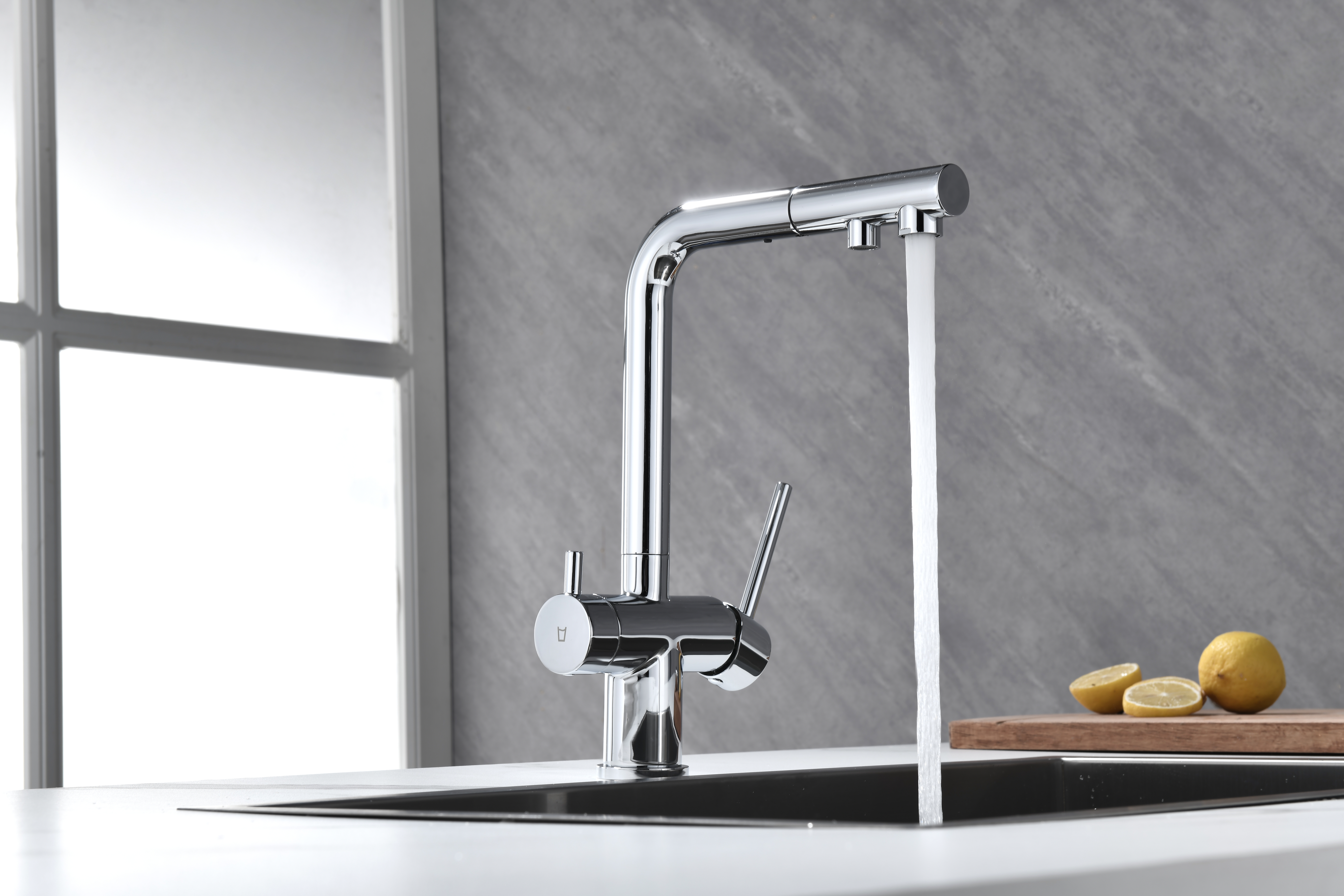 SERPENTINE оснащён функцией TRINKWASSER - излив смесителя имеет встроенный независимый канал для питьевой воды из фильтра, таким образом питьевая и водопроводная вода не смешиваются. Управление питьевой водой осуществляется отдельным рычагом, расположенным слева. Для пуска водопроводной воды используется большой рычаг справа.